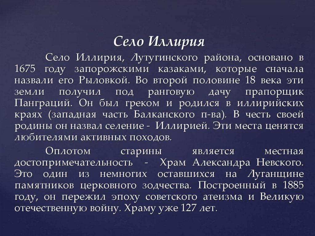 Село ИллирияСело Иллирия, Лутугинского района, основано в