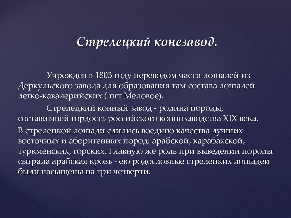 Стрелецкий конезавод.Учрежден в 1803 году переводом части лошадей из