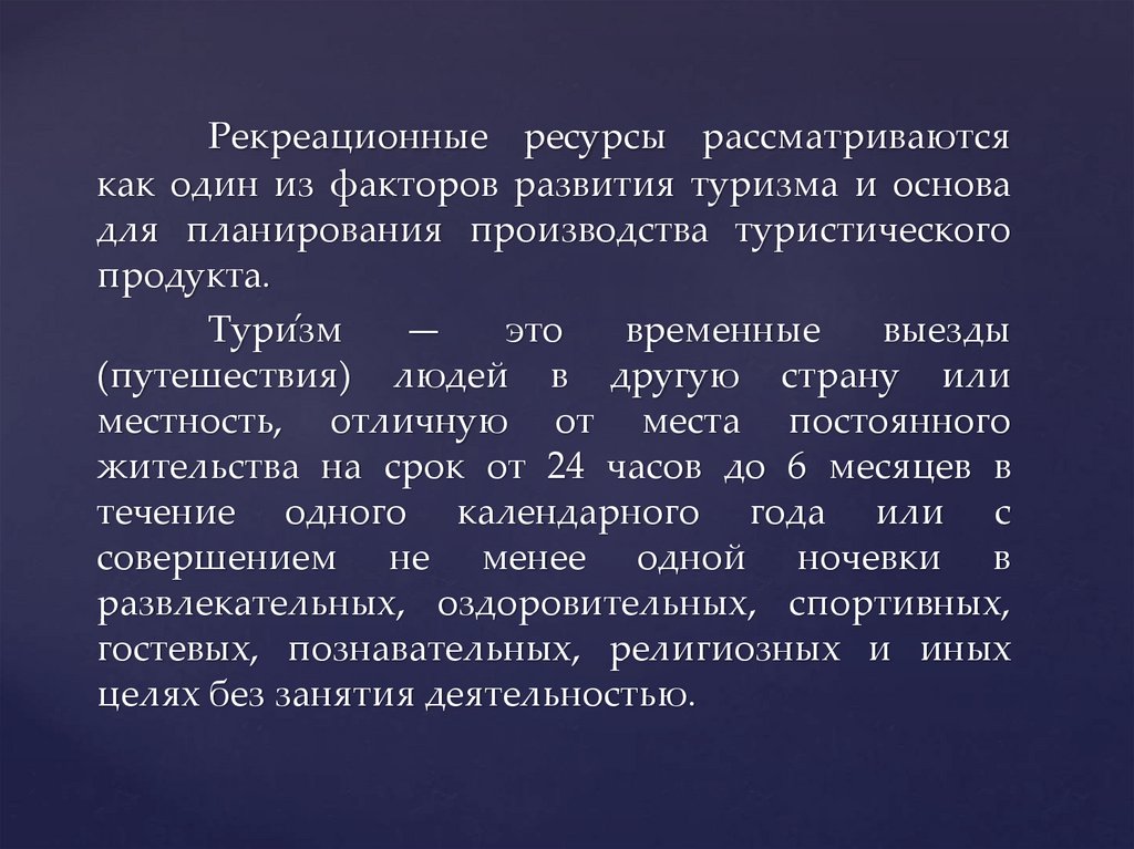 Рекреационные ресурсы рассматриваютсякак один из факторов развития туризма и основа