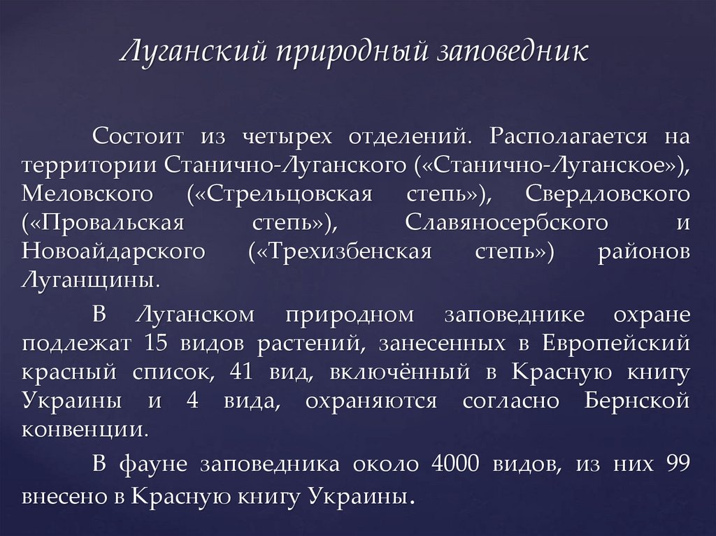 Луганский природный заповедникСостоит из четырех отделений. Располагается на