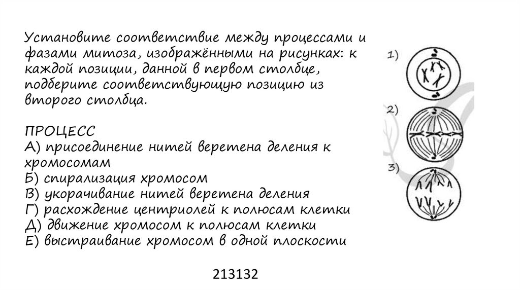 Установите соответствие между процессами ифазами митоза, изображёнными на рисунках: к