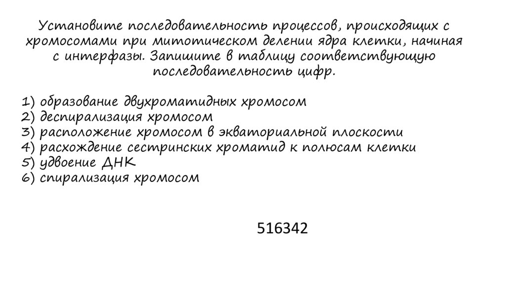 Установите последовательность процессов, происходящих схромосомами при митотическом делении ядра клетки, начиная