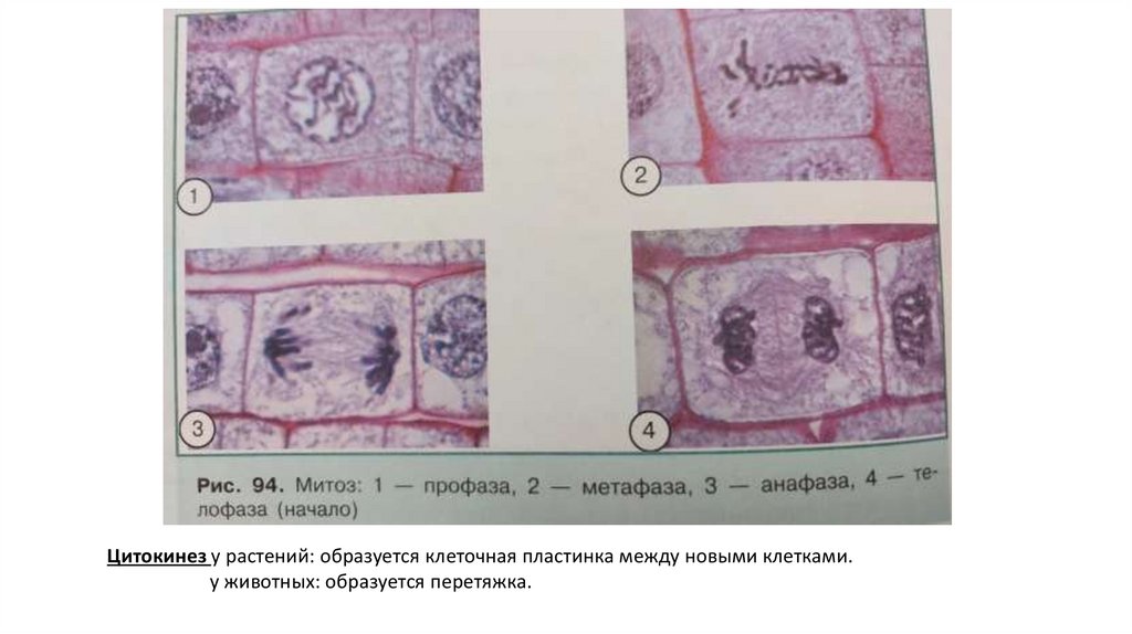 Цитокинез у растений: образуется клеточная пластинка между новыми клетками.у животных: образуется перетяжка.
