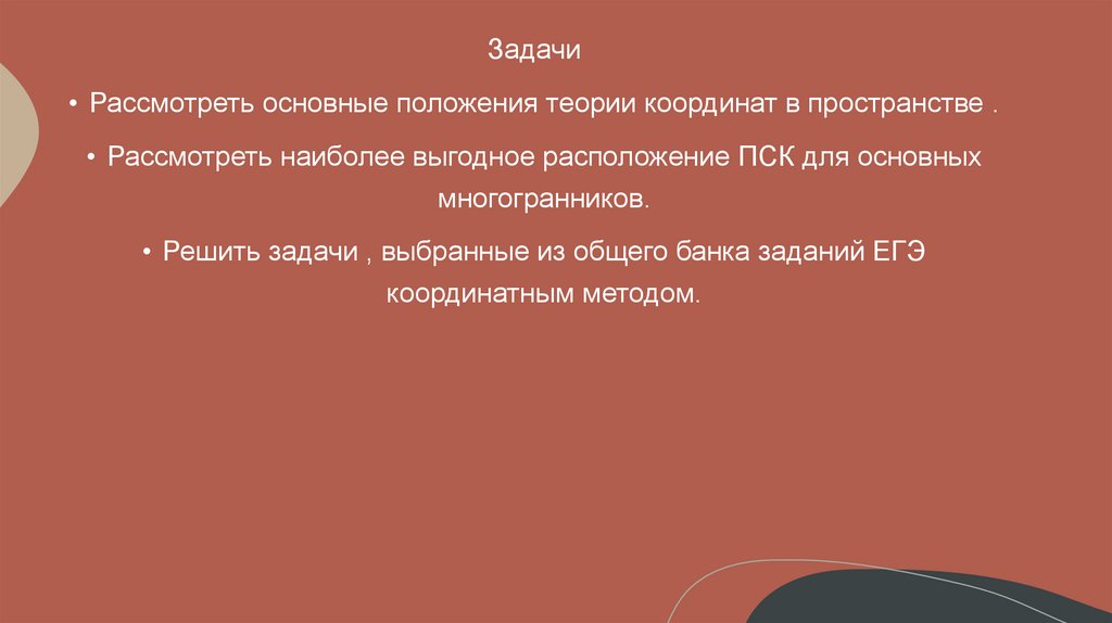 Задачи• Рассмотреть основные положения теории координат в пространстве .