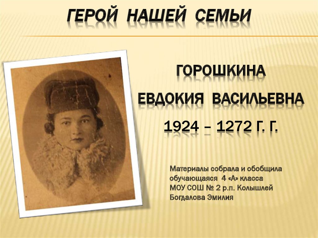ГОРОШКИНА ЕВДОКИЯ ВАСИЛЬЕВНА1924 – 1272 Г. Г.