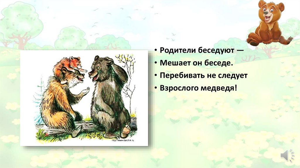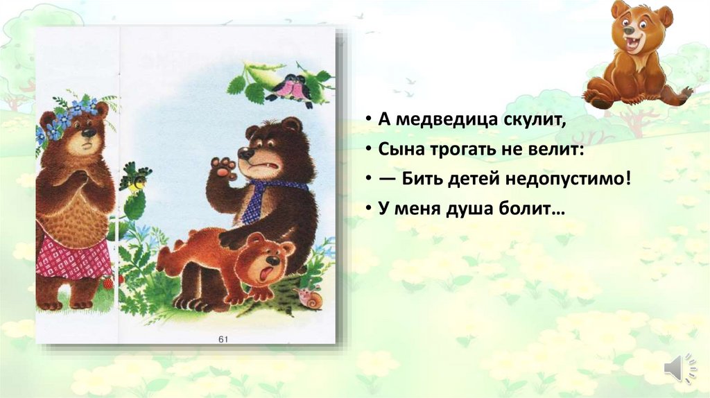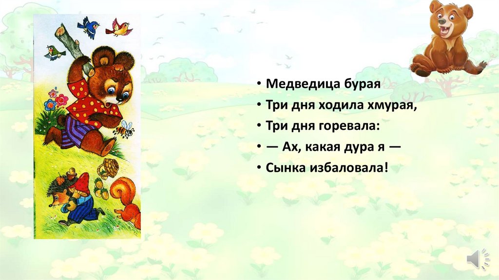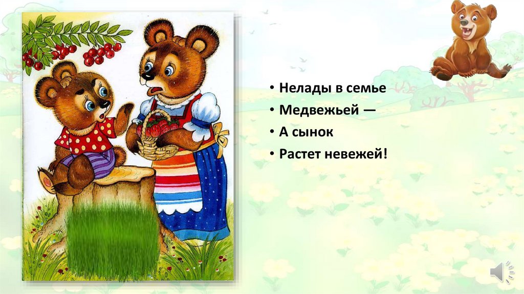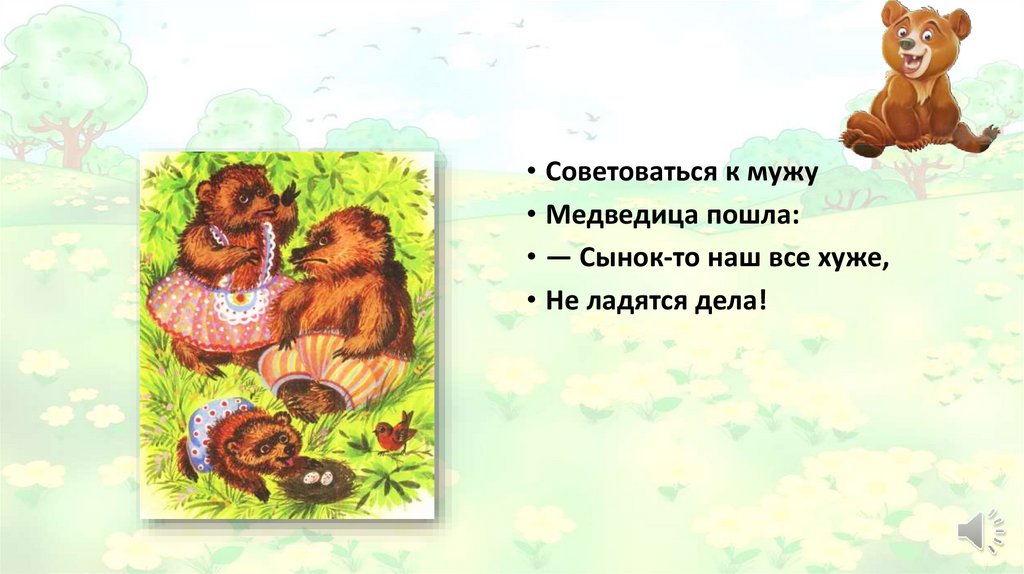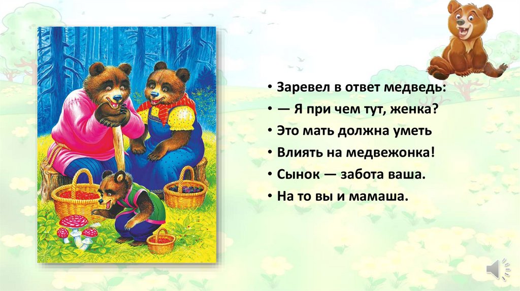 • Заревел в ответ медведь:• — Я при чем тут, женка?