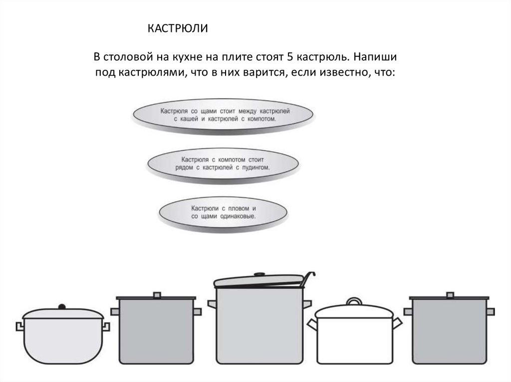 КАСТРЮЛИВ столовой на кухне на плите стоят 5 кастрюль. Напиши