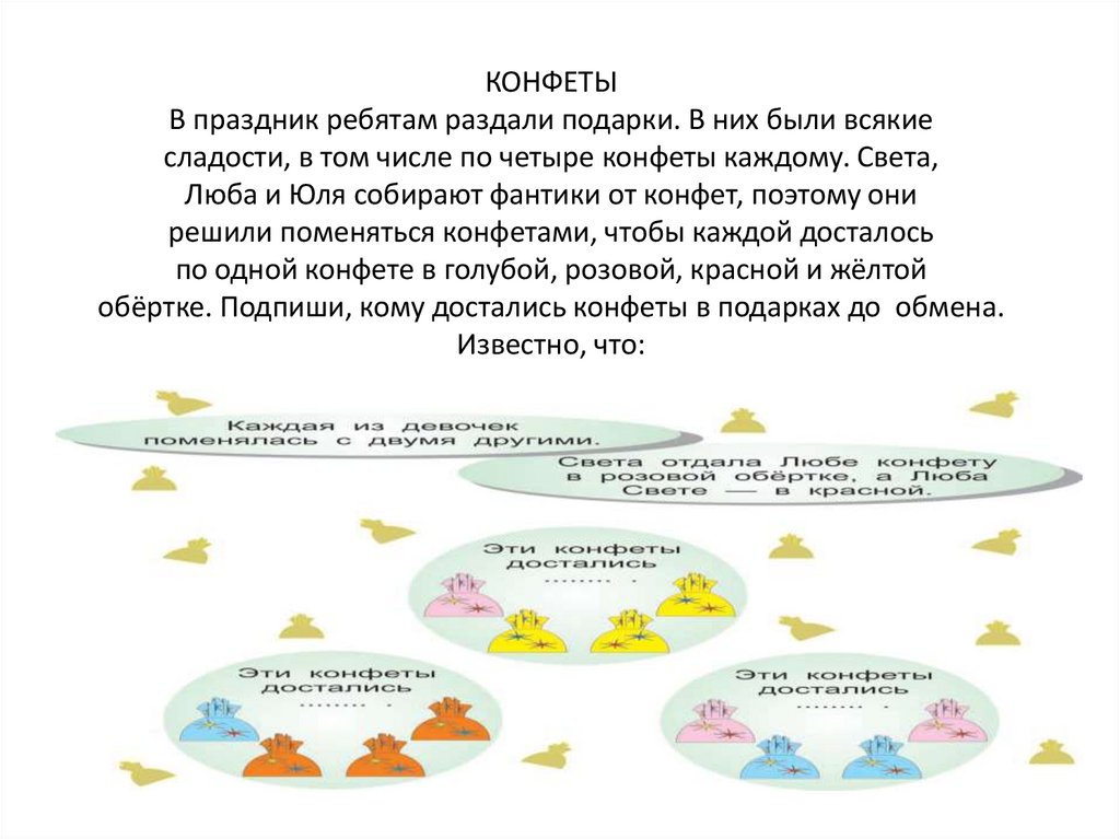 сладости, в том числе по четыре конфеты каждому. Света,
