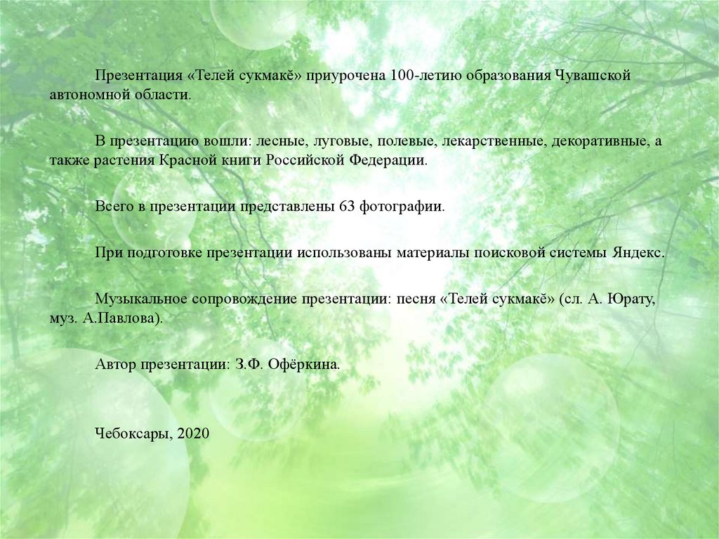 Музыкальное сопровождение презентации: песня «Телей сукмакĕ» (сл. А. Юрату,