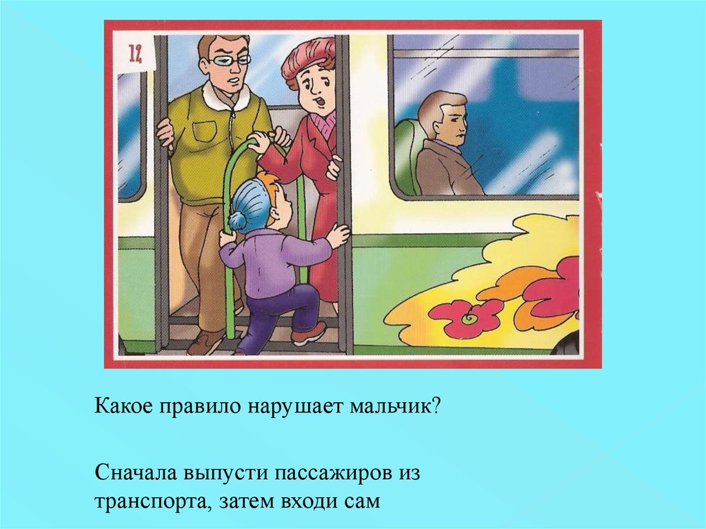 Какое правило нарушает мальчик?Сначала выпусти пассажиров из