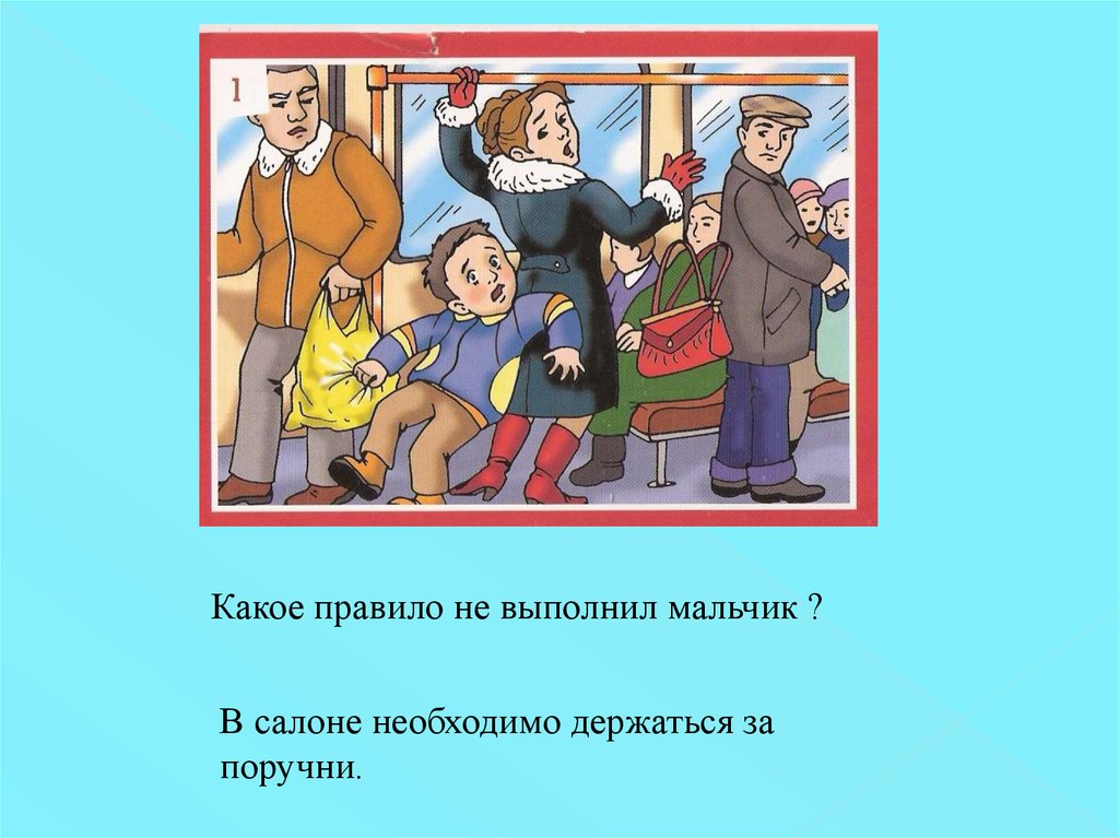 Какое правило не выполнил мальчик ?В салоне необходимо держаться за