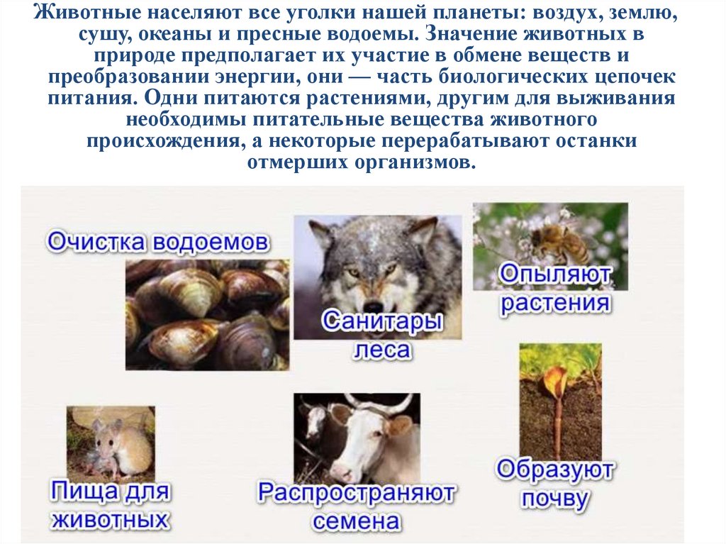 Животные населяют все уголки нашей планеты: воздух, землю,сушу, океаны и пресные водоемы. Значение животных в