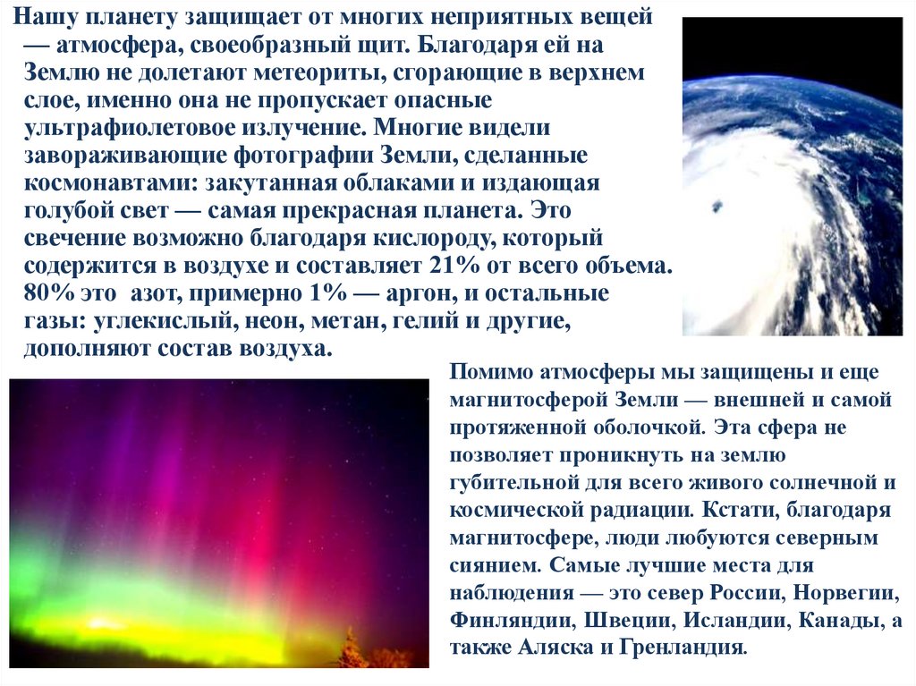 Нашу планету защищает от многих неприятных вещей— атмосфера, своеобразный щит. Благодаря ей на