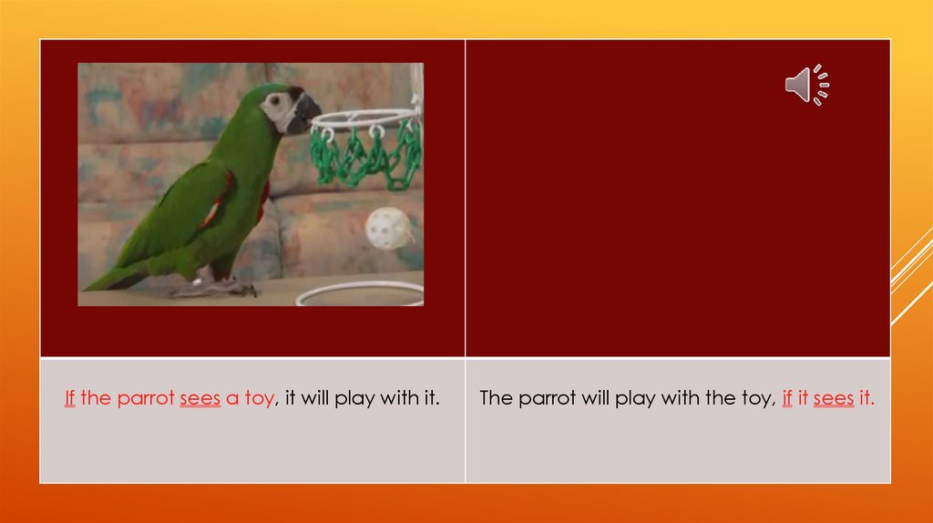 If the parrot sees a toy, it will play with it.The parrot will play with the toy, if it sees it.