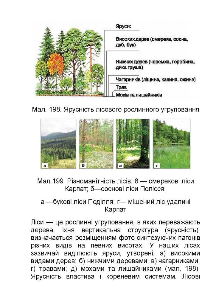 Мал. 198. Ярусність лісового рослинного угрупованняМал.199. Різноманітність лісів: 8 — смерекові ліси