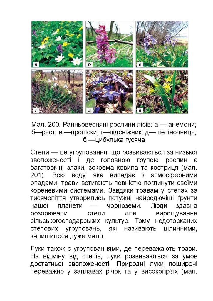 Мал. 200. Ранньовесняні рослини лісів: a — анемони;б—ряст: в —проліски; г—підсніжник; д— печіночниця;