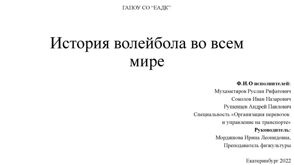 ГАПОУ СО “ЕАДК”История волейбола во всем