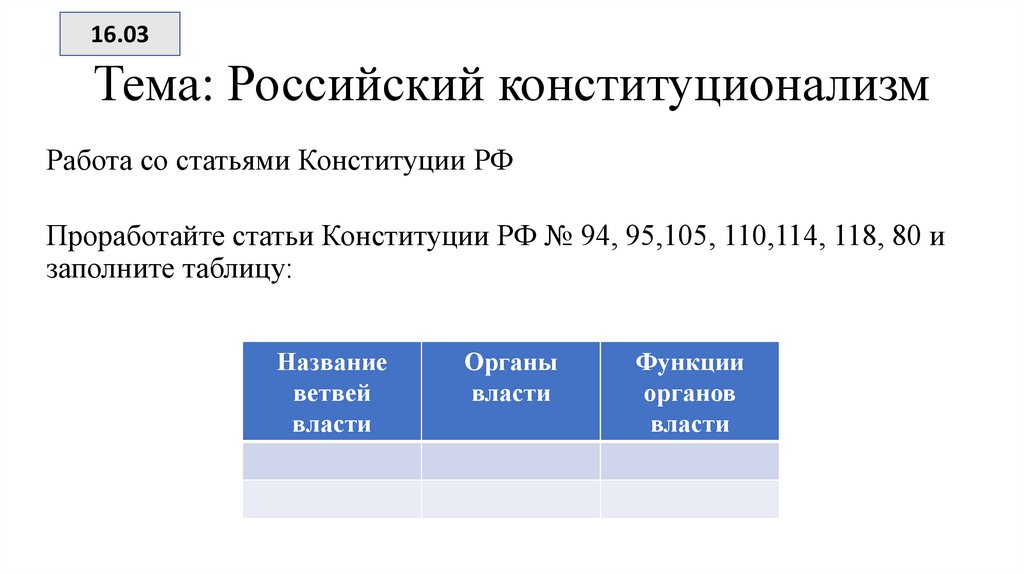 Проработайте статьи Конституции РФ № 94, 95,105, 110,114, 118, 80 и