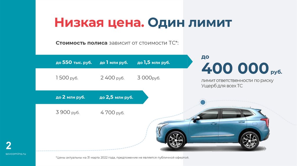 Низкая цена. Один лимитСтоимость полиса зависит от стоимости ТС*: