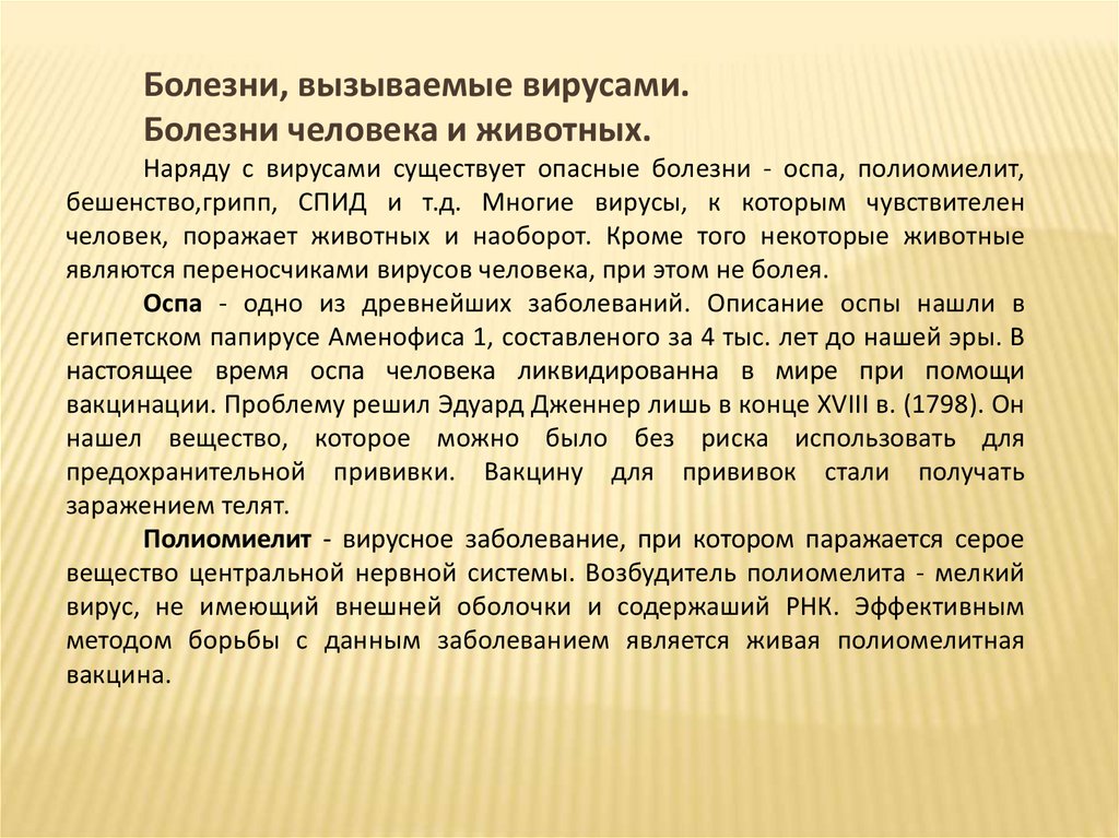 Болезни, вызываемые вирусами.Болезни человека и животных.