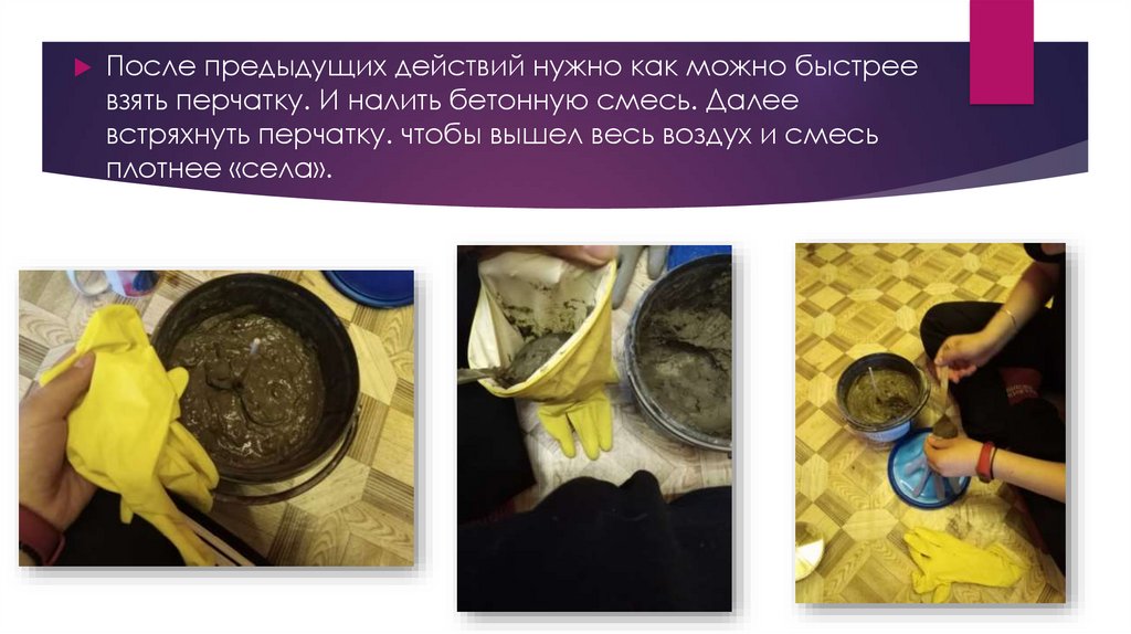 После предыдущих действий нужно как можно быстреевзять перчатку. И налить бетонную смесь. Далее