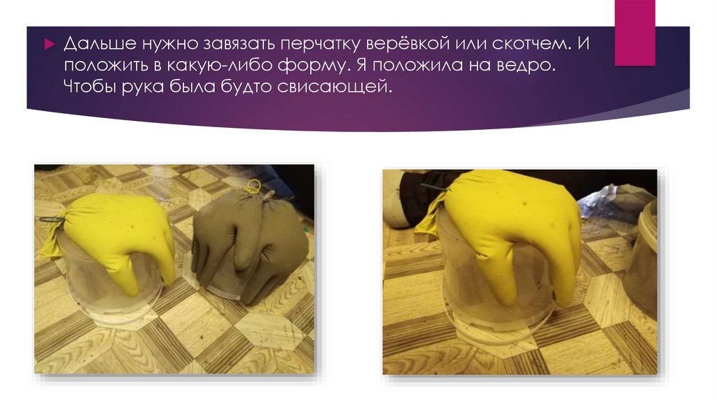 Дальше нужно завязать перчатку верёвкой или скотчем. Иположить в какую-либо форму. Я положила на ведро.
