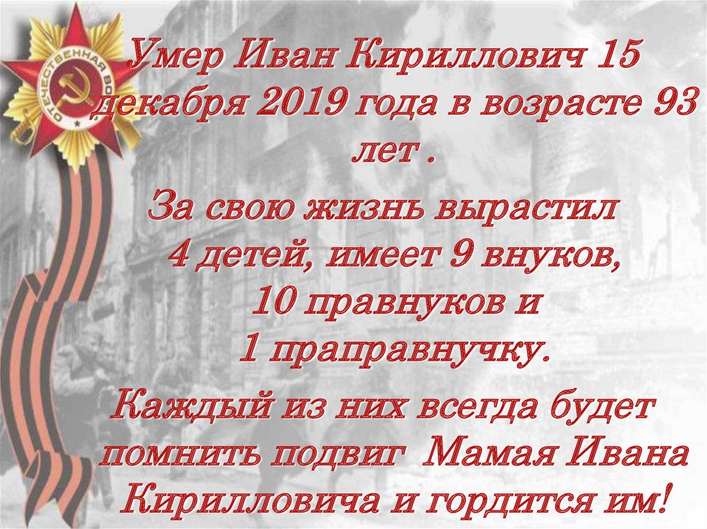 Умер Иван Кириллович 15декабря 2019 года в возрасте 93