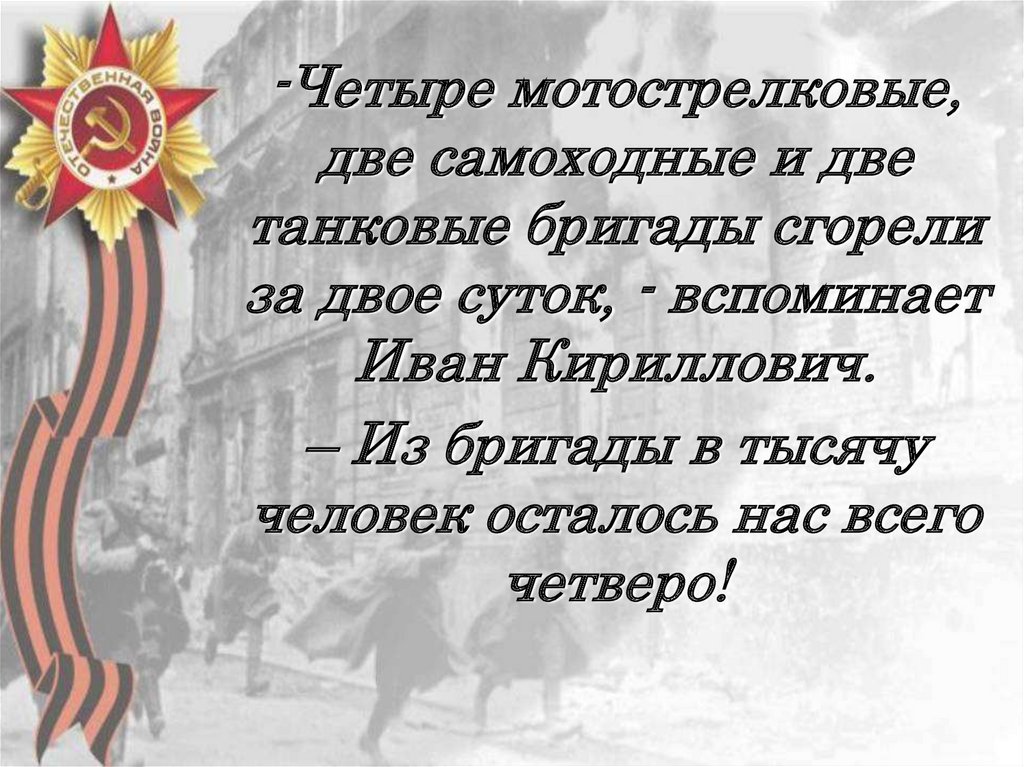 9. Довелось Ивану Кирилловичу воевать и во фронтовой разведке, так называемом СМЕРШе. Хорошо помнит, как шел пешком без оружия 12