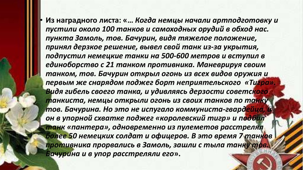 • Из наградного листа: «… Когда немцы начали артподготовку ипустили около 100 танков и самоходных орудий в обход нас.