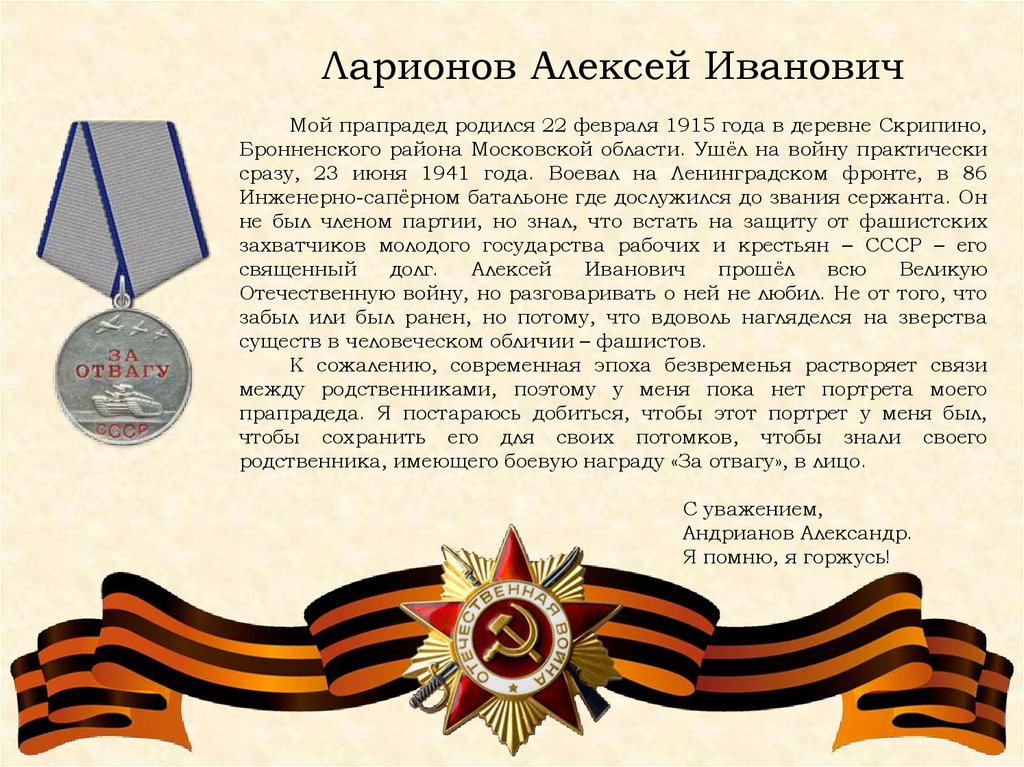 Ларионов Алексей ИвановичМой прапрадед родился 22 февраля 1915 года в деревне Скрипино,