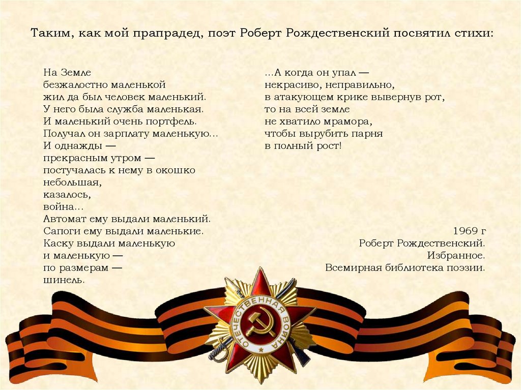 Таким, как мой прапрадед, поэт Роберт Рождественский посвятил стихи:На Земле