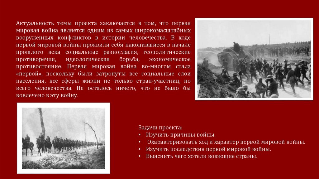 Актуальность темы проекта заключается в том, что перваямировая война является одним из самых широкомасштабных