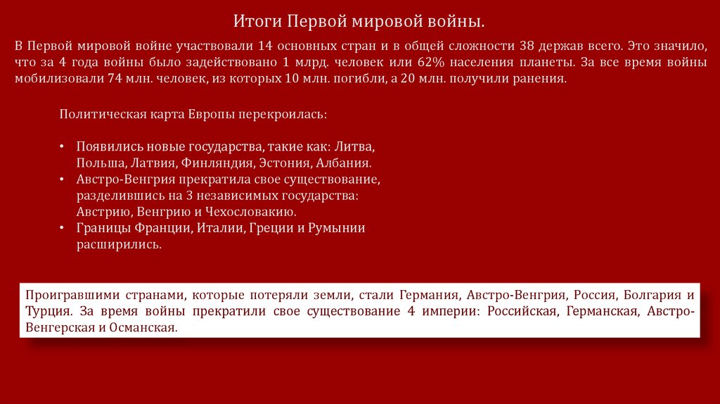 • Выяснить чего хотели воюющие страны.