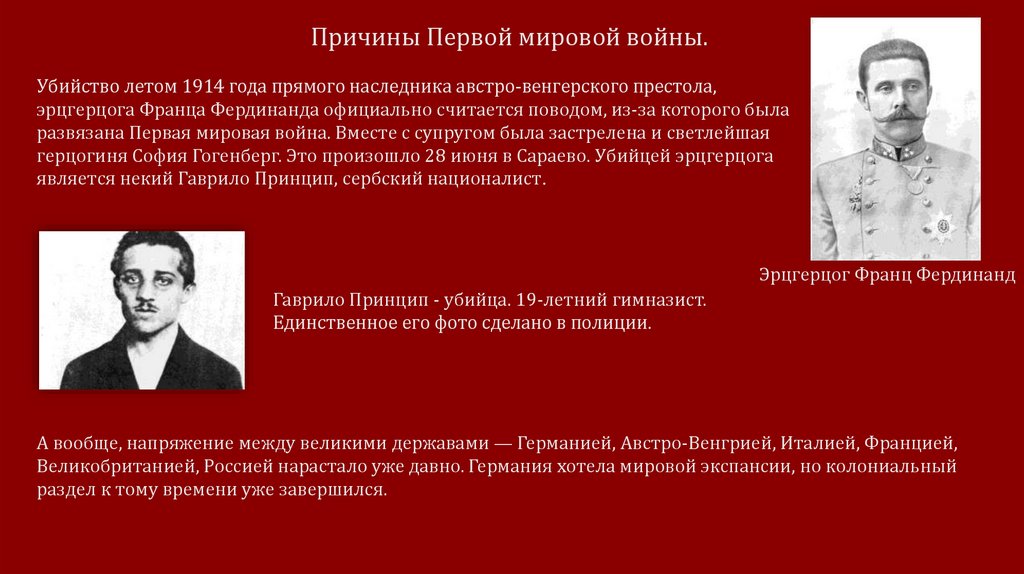 Причины Первой мировой войны.Убийство летом 1914 года прямого наследника австро-венгерского престола,