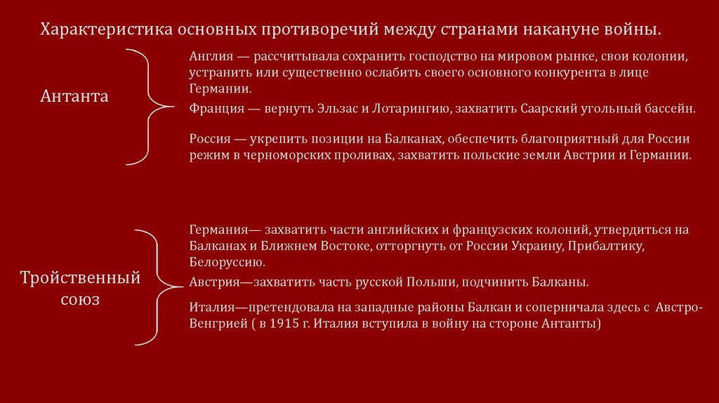Характеристика основных противоречий между странами накануне войны.Антанта