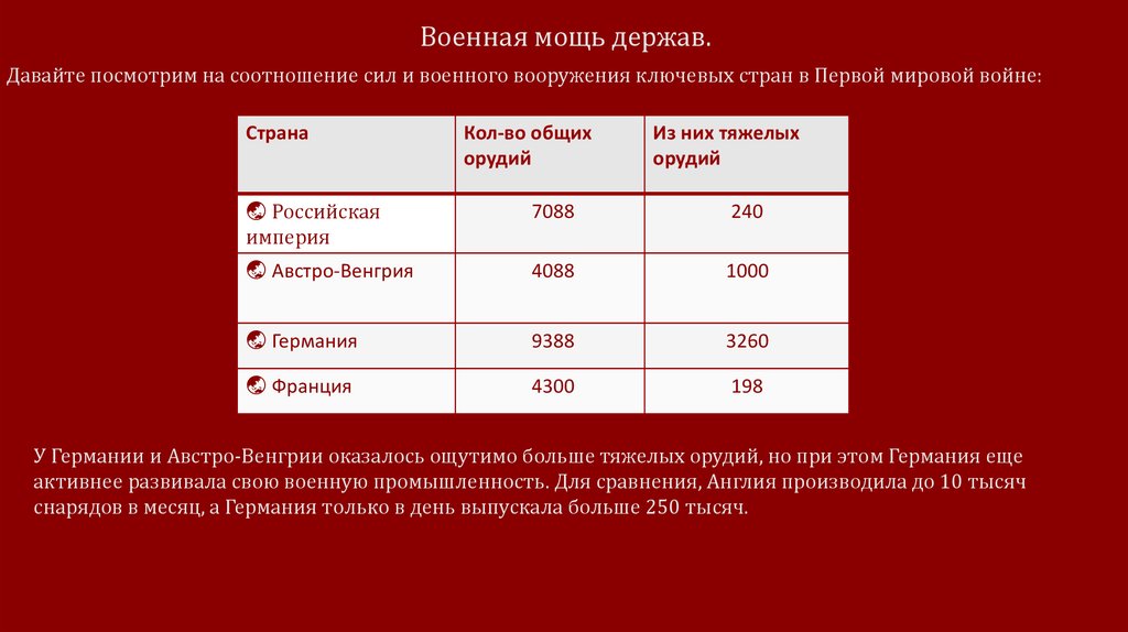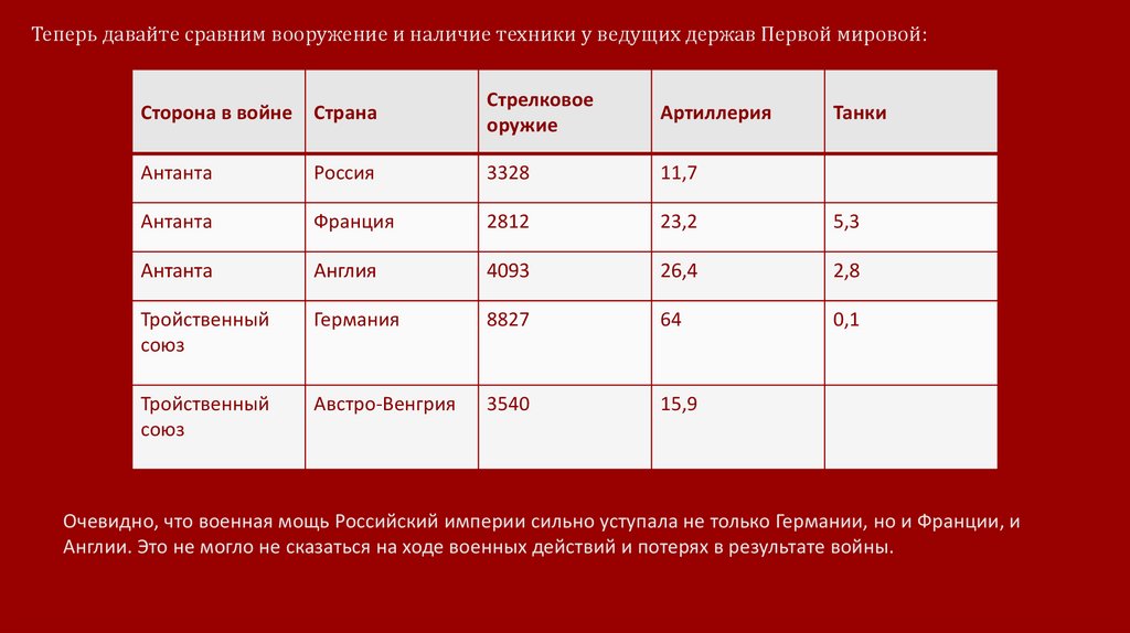 Военная мощь держав.Давайте посмотрим на соотношение сил и военного вооружения ключевых стран в Первой мировой войне:
