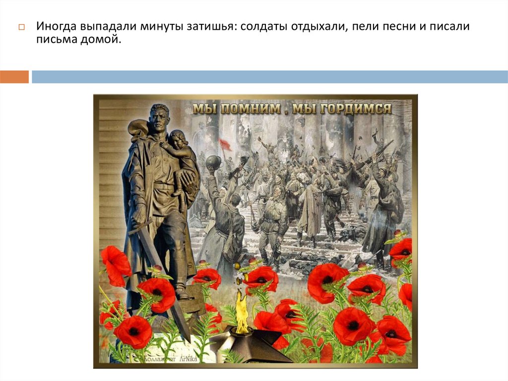 Иногда выпадали минуты затишья: солдаты отдыхали, пели песни и писалиписьма домой.