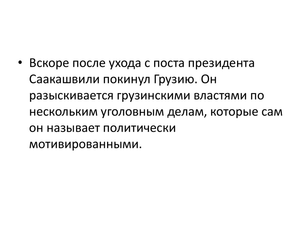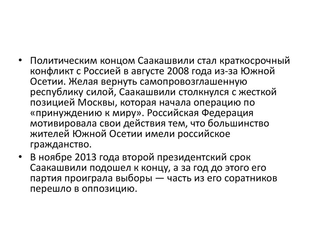 • Политическим концом Саакашвили стал краткосрочныйконфликт с Россией в августе 2008 года из-за Южной