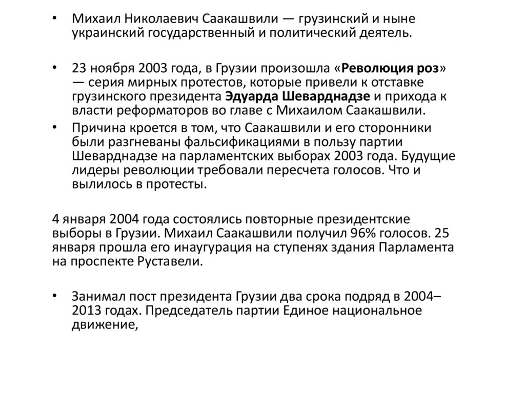 • Занимал пост президента Грузии два срока подряд в 2004–