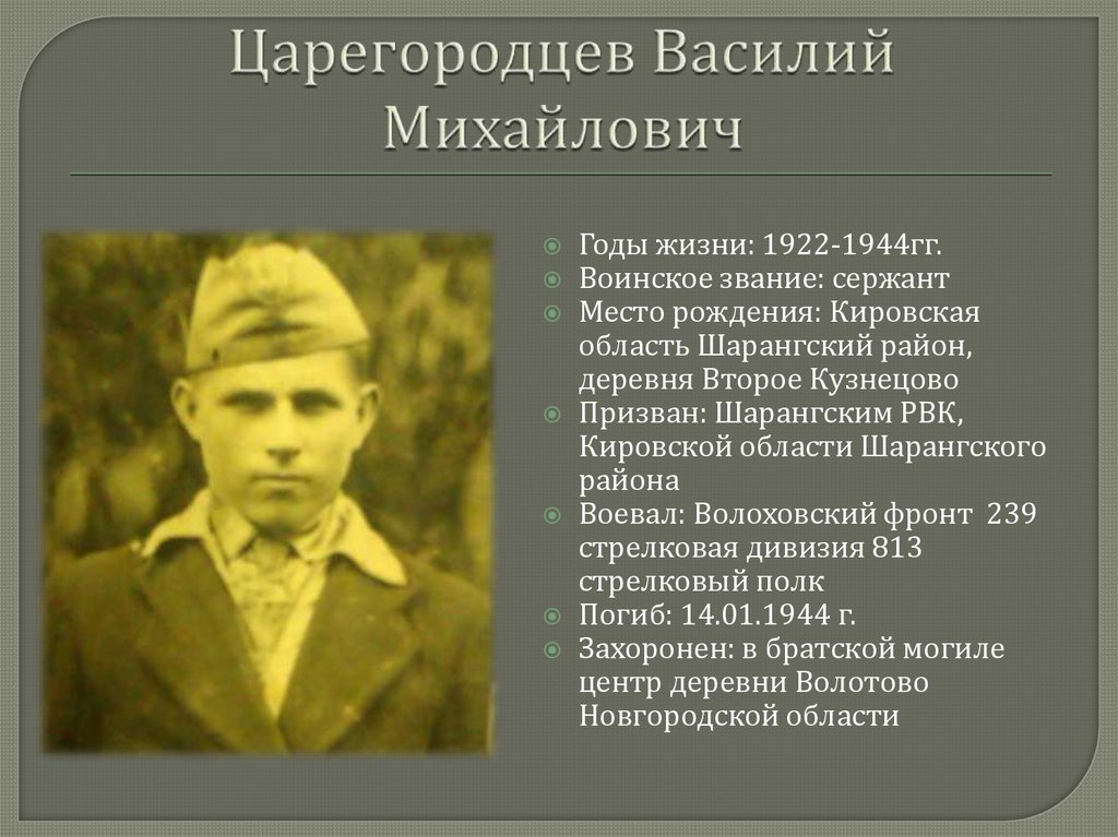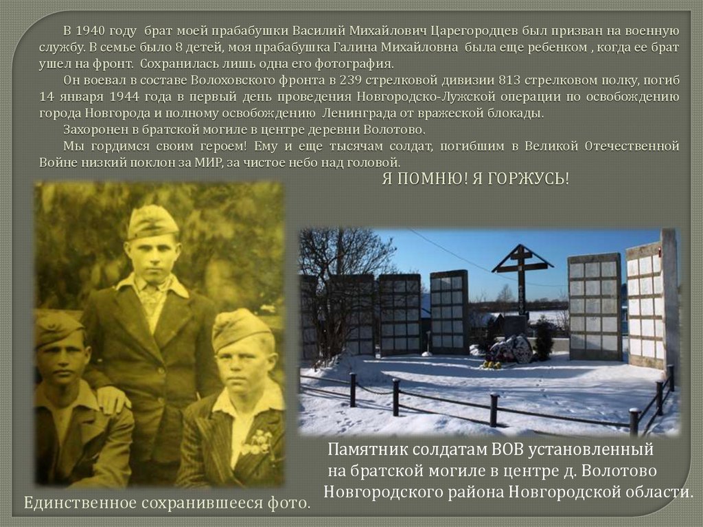 В 1940 году брат моей прабабушки Василий Михайлович Царегородцев был призван на военнуюслужбу. В семье было 8 детей, моя прабабушка Галина Михайловна была еще ребенком , когда ее брат