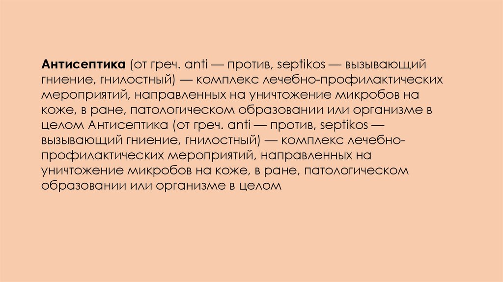 Антисептика (от греч. anti — против, septikos — вызывающийгниение, гнилостный) — комплекс лечебно-профилактических