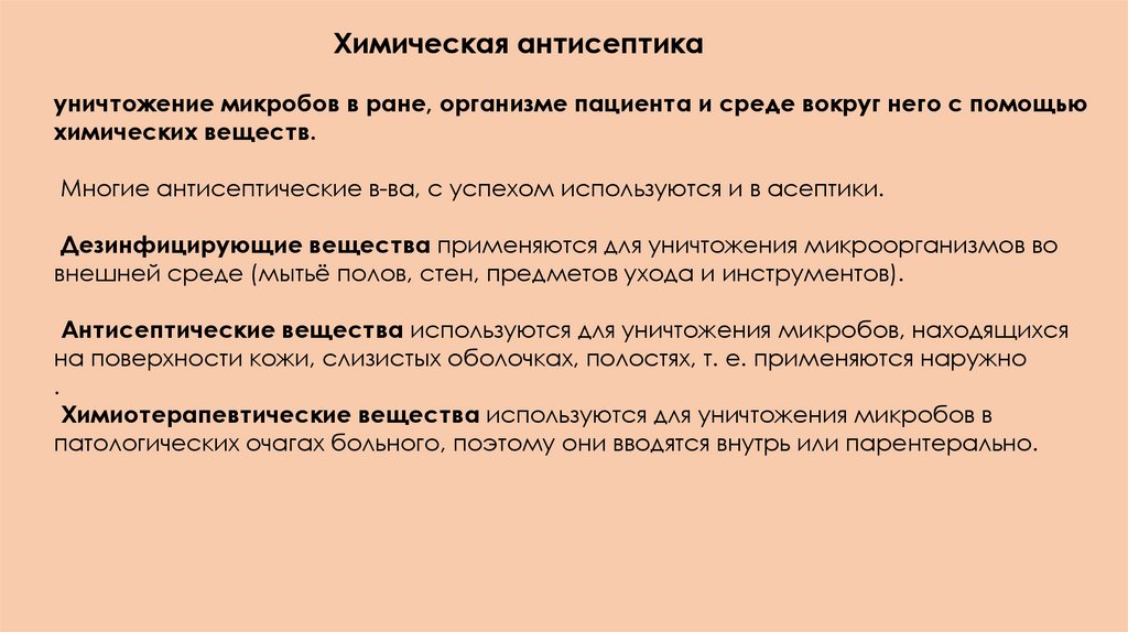 Химическая антисептикауничтожение микробов в ране, организме пациента и среде вокруг него с помощью