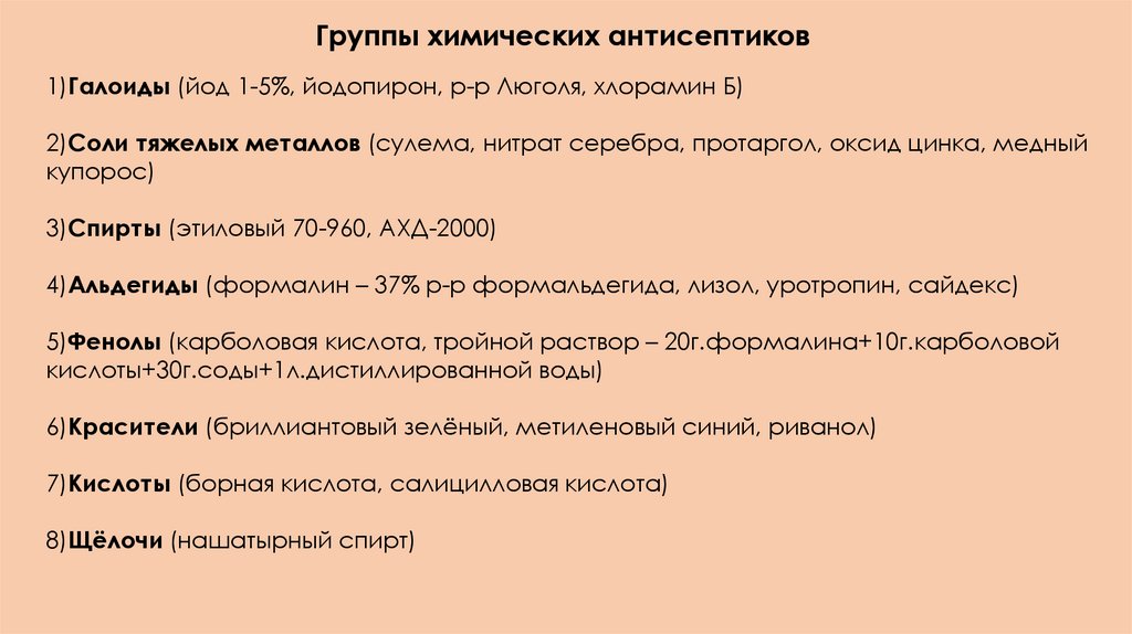 Группы химических антисептиков1)Галоиды (йод 1-5%, йодопирон, р-р Люголя, хлорамин Б)