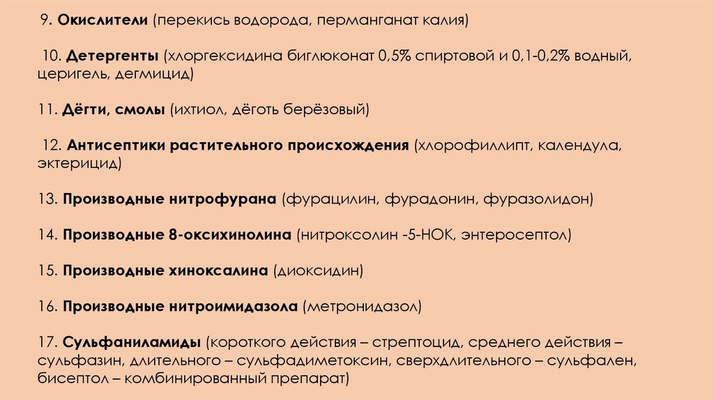 9. Окислители (перекись водорода, перманганат калия)10. Детергенты (хлоргексидина биглюконат 0,5% спиртовой и 0,1-0,2% водный,