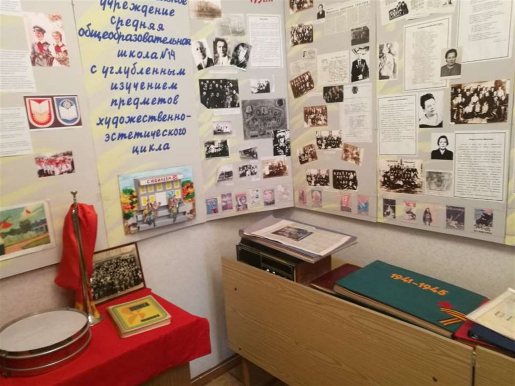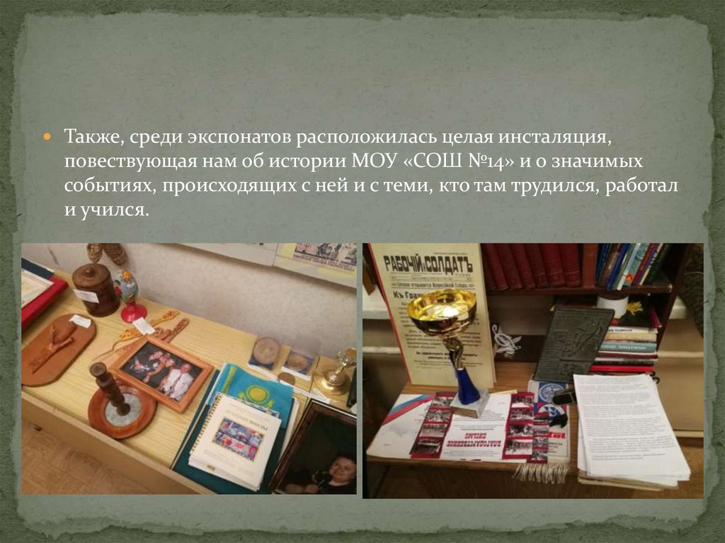 Также, среди экспонатов расположилась целая инсталяция,повествующая нам об истории МОУ «СОШ №14» и о значимых