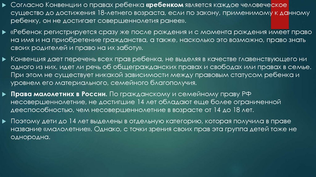 Согласно Конвенции о правах ребенка «ребенком является каждое человеческоесущество до достижения 18-летнего возраста, если по закону, применимому к данному