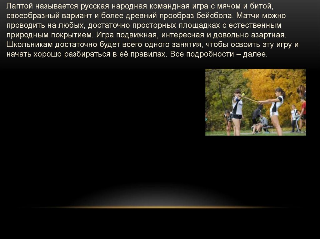 Лаптой называется русская народная командная игра с мячом и битой,своеобразный вариант и более древний прообраз бейсбола. Матчи можно