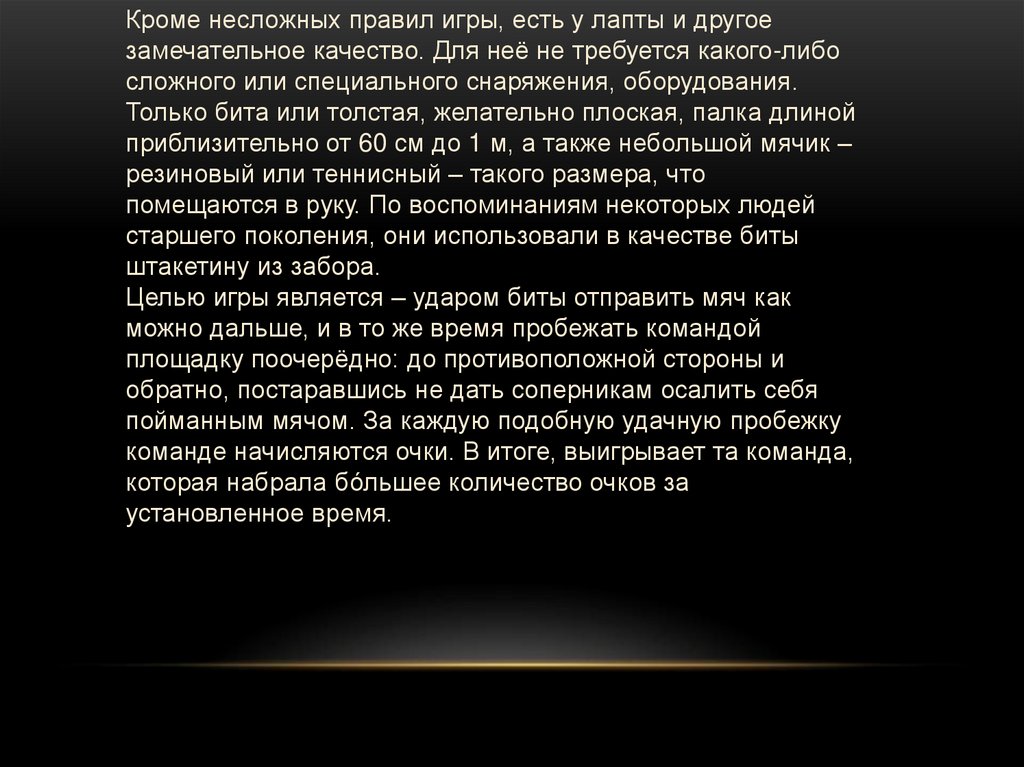 Кроме несложных правил игры, есть у лапты и другоезамечательное качество. Для неё не требуется какого-либо