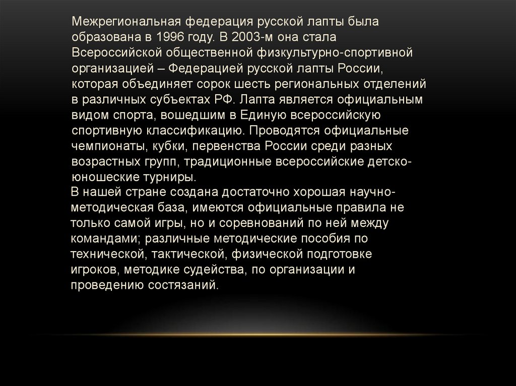 Межрегиональная федерация русской лапты былаобразована в 1996 году. В 2003-м она стала