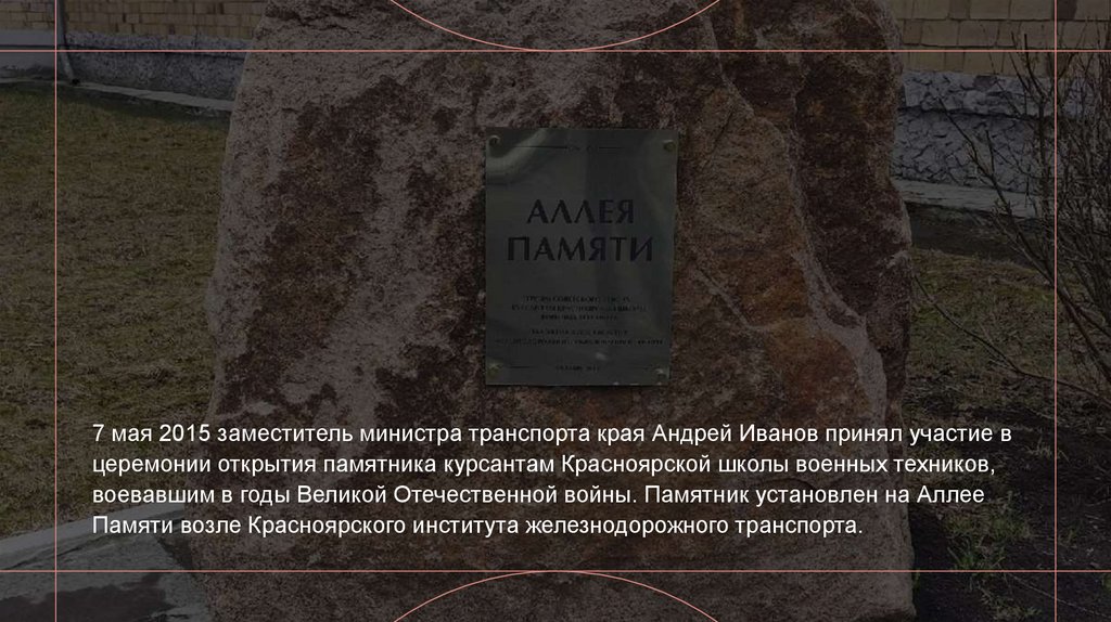 7 мая 2015 заместитель министра транспорта края Андрей Иванов принял участие вцеремонии открытия памятника курсантам Красноярской школы военных техников,